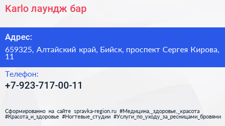 Karlo, лаундж-бар по адресу 659325, Алтайский край, Бийск, проспект Сергея Кирова, 11 в дальнейшем Организация, размещена в следующих категориях: