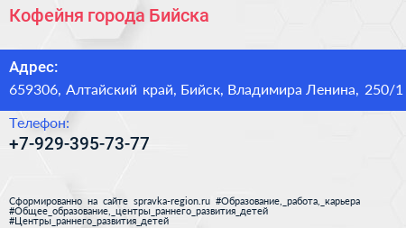 Кофейня города Бийска по адресу 659306, Алтайский край, Бийск, Владимира Ленина, 250/1 в дальнейшем Организация, размещена в следующих категориях:
