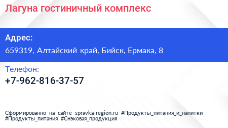 Лагуна, гостиничный комплекс по адресу 659319, Алтайский край, Бийск, Ермака, 8 в дальнейшем Организация, размещена в следующих категориях: