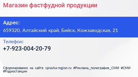 Магазин фастфудной продукции по адресу 659320, Алтайский край, Бийск, Кожзаводская, 21 в дальнейшем Организация, размещена в следующих категориях: