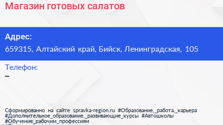 Магазин готовых салатов по адресу 659315, Алтайский край, Бийск, Ленинградская, 105 в дальнейшем Организация, размещена в следующих категориях: