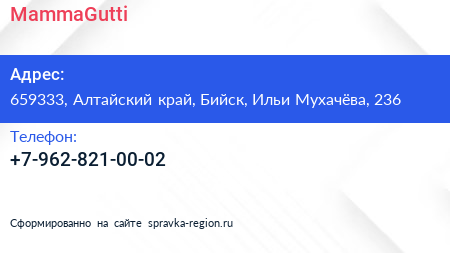 MammaGutti по адресу 659333, Алтайский край, Бийск, Ильи Мухачёва, 236 в дальнейшем Организация, размещена в следующих категориях: