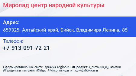 Миролад, центр народной культуры по адресу 659325, Алтайский край, Бийск, Владимира Ленина, 85 в дальнейшем Организация, размещена в следующих категориях: