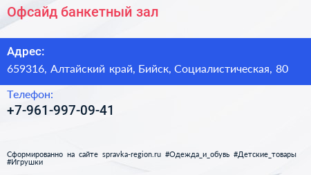 Офсайд, банкетный зал по адресу 659316, Алтайский край, Бийск, Социалистическая, 80 в дальнейшем Организация, размещена в следующих категориях: