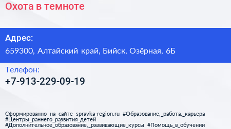 Охота в темноте по адресу 659300, Алтайский край, Бийск, Озёрная, 6Б в дальнейшем Организация, размещена в следующих категориях: