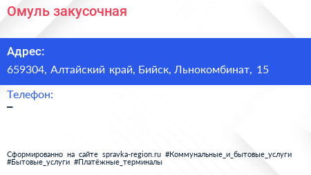 Омуль, закусочная по адресу 659304, Алтайский край, Бийск, Льнокомбинат, 15 в дальнейшем Организация, размещена в следующих категориях: