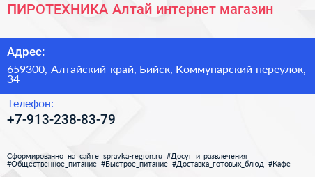 ПИРОТЕХНИКА Алтай, интернет-магазин по адресу 659300, Алтайский край, Бийск, Коммунарский переулок, 34 в дальнейшем Организация, размещена в следующих категориях: