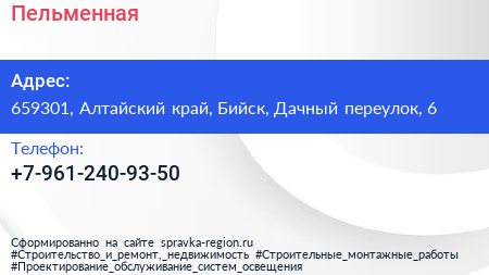 Пельменная по адресу 659301, Алтайский край, Бийск, Дачный переулок, 6 в дальнейшем Организация, размещена в следующих категориях: