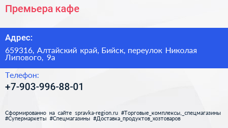 Премьера, кафе по адресу 659316, Алтайский край, Бийск, переулок Николая Липового, 9а в дальнейшем Организация, размещена в следующих категориях: