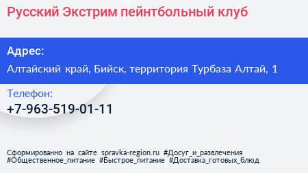 Русский Экстрим, пейнтбольный клуб по адресу Алтайский край, Бийск, территория Турбаза Алтай, 1 в дальнейшем Организация, размещена в следующих категориях: