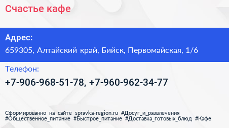 Счастье, кафе по адресу 659305, Алтайский край, Бийск, Первомайская, 1/6 в дальнейшем Организация, размещена в следующих категориях: