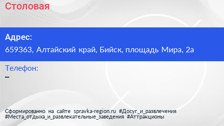Столовая по адресу 659363, Алтайский край, Бийск, площадь Мира, 2а в дальнейшем Организация, размещена в следующих категориях: