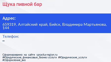Щука, пивной бар по адресу 659319, Алтайский край, Бийск, Владимира Мартьянова, 144 в дальнейшем Организация, размещена в следующих категориях: