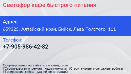 Светофор, кафе быстрого питания по адресу 659325, Алтайский край, Бийск, Льва Толстого, 111 в дальнейшем Организация, размещена в следующих категориях: