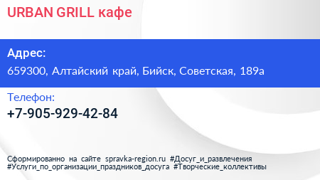 URBAN GRILL, кафе по адресу 659300, Алтайский край, Бийск, Советская, 189а в дальнейшем Организация, размещена в следующих категориях: