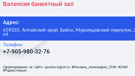 Валенсия, банкетный зал по адресу 659333, Алтайский край, Бийск, Муромцевский переулок, 2 к4 в дальнейшем Организация, размещена в следующих категориях: