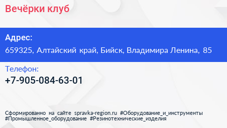 Вечёрки, клуб по адресу 659325, Алтайский край, Бийск, Владимира Ленина, 85 в дальнейшем Организация, размещена в следующих категориях: