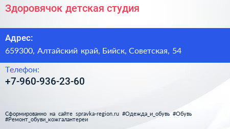 Здоровячок, детская студия по адресу 659300, Алтайский край, Бийск, Советская, 54 в дальнейшем Организация, размещена в следующих категориях: