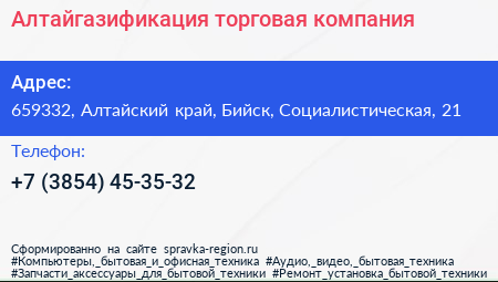 Алтайгазификация, торговая компания по адресу 659332, Алтайский край, Бийск, Социалистическая, 21 в дальнейшем Организация, размещена в следующих категориях: