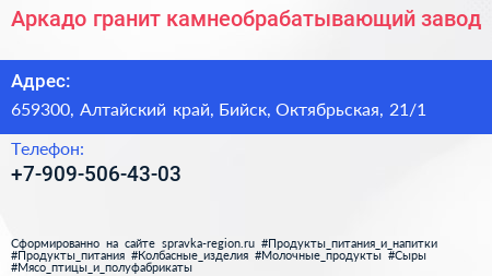 Аркадо-гранит, камнеобрабатывающий завод по адресу 659300, Алтайский край, Бийск, Октябрьская, 21/1 в дальнейшем Организация, размещена в следующих категориях: