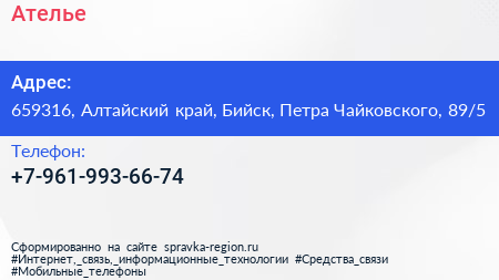 Ателье по адресу 659316, Алтайский край, Бийск, Петра Чайковского, 89/5 в дальнейшем Организация, размещена в следующих категориях: