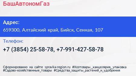 БашАвтономГаз по адресу 659300, Алтайский край, Бийск, Сенная, 107 в дальнейшем Организация, размещена в следующих категориях: