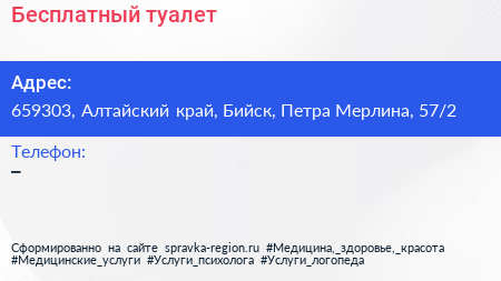 Бесплатный туалет по адресу 659303, Алтайский край, Бийск, Петра Мерлина, 57/2 в дальнейшем Организация, размещена в следующих категориях: