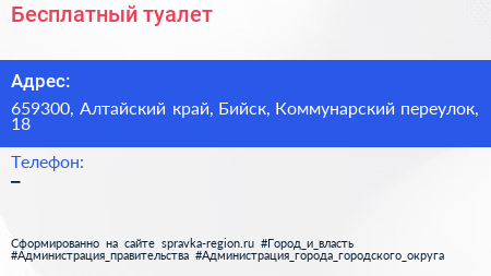 Бесплатный туалет по адресу 659300, Алтайский край, Бийск, Коммунарский переулок, 18 в дальнейшем Организация, размещена в следующих категориях: