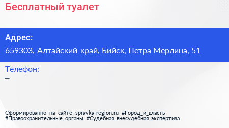 Бесплатный туалет по адресу 659303, Алтайский край, Бийск, Петра Мерлина, 51 в дальнейшем Организация, размещена в следующих категориях: