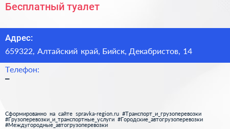 Бесплатный туалет по адресу 659322, Алтайский край, Бийск, Декабристов, 14 в дальнейшем Организация, размещена в следующих категориях: