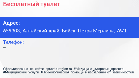 Бесплатный туалет по адресу 659303, Алтайский край, Бийск, Петра Мерлина, 76/1 в дальнейшем Организация, размещена в следующих категориях: