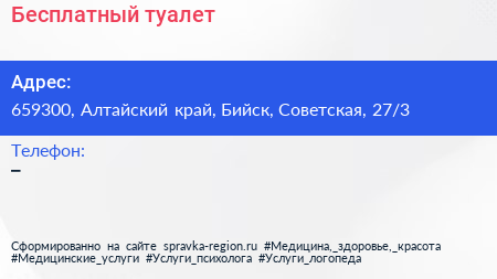 Бесплатный туалет по адресу 659300, Алтайский край, Бийск, Советская, 27/3 в дальнейшем Организация, размещена в следующих категориях: