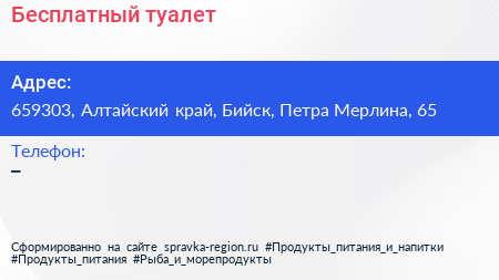 Бесплатный туалет по адресу 659303, Алтайский край, Бийск, Петра Мерлина, 65 в дальнейшем Организация, размещена в следующих категориях:
