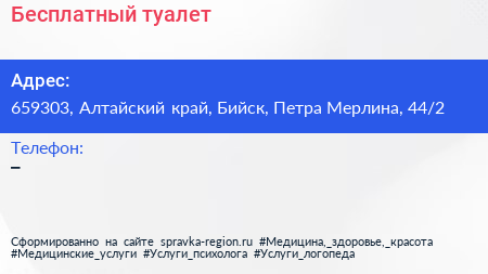 Бесплатный туалет по адресу 659303, Алтайский край, Бийск, Петра Мерлина, 44/2 в дальнейшем Организация, размещена в следующих категориях: