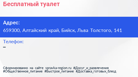 Бесплатный туалет по адресу 659300, Алтайский край, Бийск, Льва Толстого, 141 в дальнейшем Организация, размещена в следующих категориях: