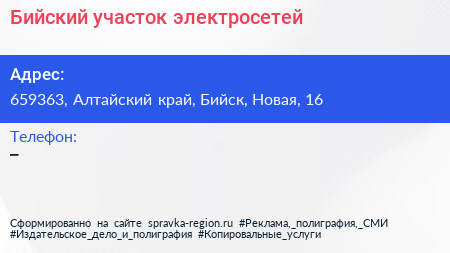 Бийский участок электросетей по адресу 659363, Алтайский край, Бийск, Новая, 16 в дальнейшем Организация, размещена в следующих категориях: