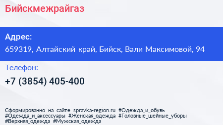 Бийскмежрайгаз по адресу 659319, Алтайский край, Бийск, Вали Максимовой, 94 в дальнейшем Организация, размещена в следующих категориях: