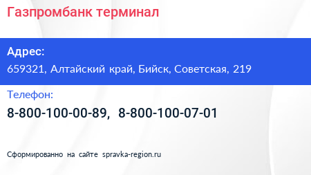 Газпромбанк, терминал по адресу 659321, Алтайский край, Бийск, Советская, 219 в дальнейшем Организация, размещена в следующих категориях: