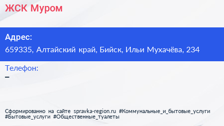 ЖСК Муром по адресу 659335, Алтайский край, Бийск, Ильи Мухачёва, 234 в дальнейшем Организация, размещена в следующих категориях:
