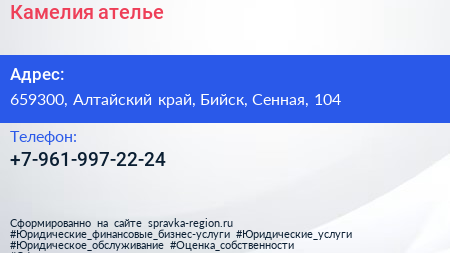 Камелия, ателье по адресу 659300, Алтайский край, Бийск, Сенная, 104 в дальнейшем Организация, размещена в следующих категориях:
