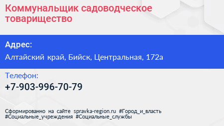 Коммунальщик, садоводческое товарищество по адресу Алтайский край, Бийск, Центральная, 172а в дальнейшем Организация, размещена в следующих категориях: