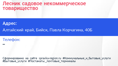 Лесник, садовое некоммерческое товарищество по адресу Алтайский край, Бийск, Павла Корчагина, 40Б в дальнейшем Организация, размещена в следующих категориях: