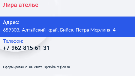 Лира, ателье по адресу 659303, Алтайский край, Бийск, Петра Мерлина, 4 в дальнейшем Организация, размещена в следующих категориях: