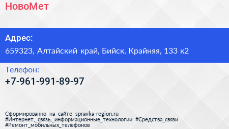 НовоМет по адресу 659323, Алтайский край, Бийск, Крайняя, 133 к2 в дальнейшем Организация, размещена в следующих категориях: