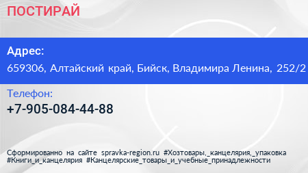 ПОСТИРАЙ по адресу 659306, Алтайский край, Бийск, Владимира Ленина, 252/2 в дальнейшем Организация, размещена в следующих категориях: