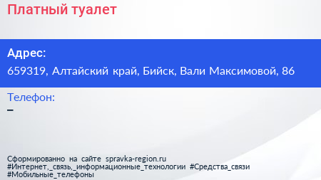 Платный туалет по адресу 659319, Алтайский край, Бийск, Вали Максимовой, 86 в дальнейшем Организация, размещена в следующих категориях: