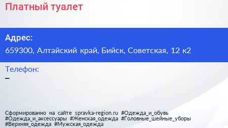 Платный туалет по адресу 659300, Алтайский край, Бийск, Советская, 12 к2 в дальнейшем Организация, размещена в следующих категориях: