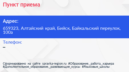 Пункт приема по адресу 659323, Алтайский край, Бийск, Байкальский переулок, 100а в дальнейшем Организация, размещена в следующих категориях: