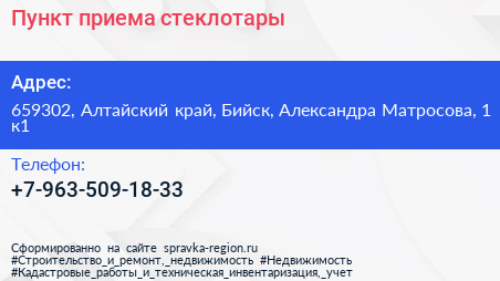 Пункт приема стеклотары по адресу 659302, Алтайский край, Бийск, Александра Матросова, 1 к1 в дальнейшем Организация, размещена в следующих категориях:
