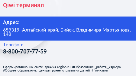 Qiwi, терминал по адресу 659319, Алтайский край, Бийск, Владимира Мартьянова, 148 в дальнейшем Организация, размещена в следующих категориях: